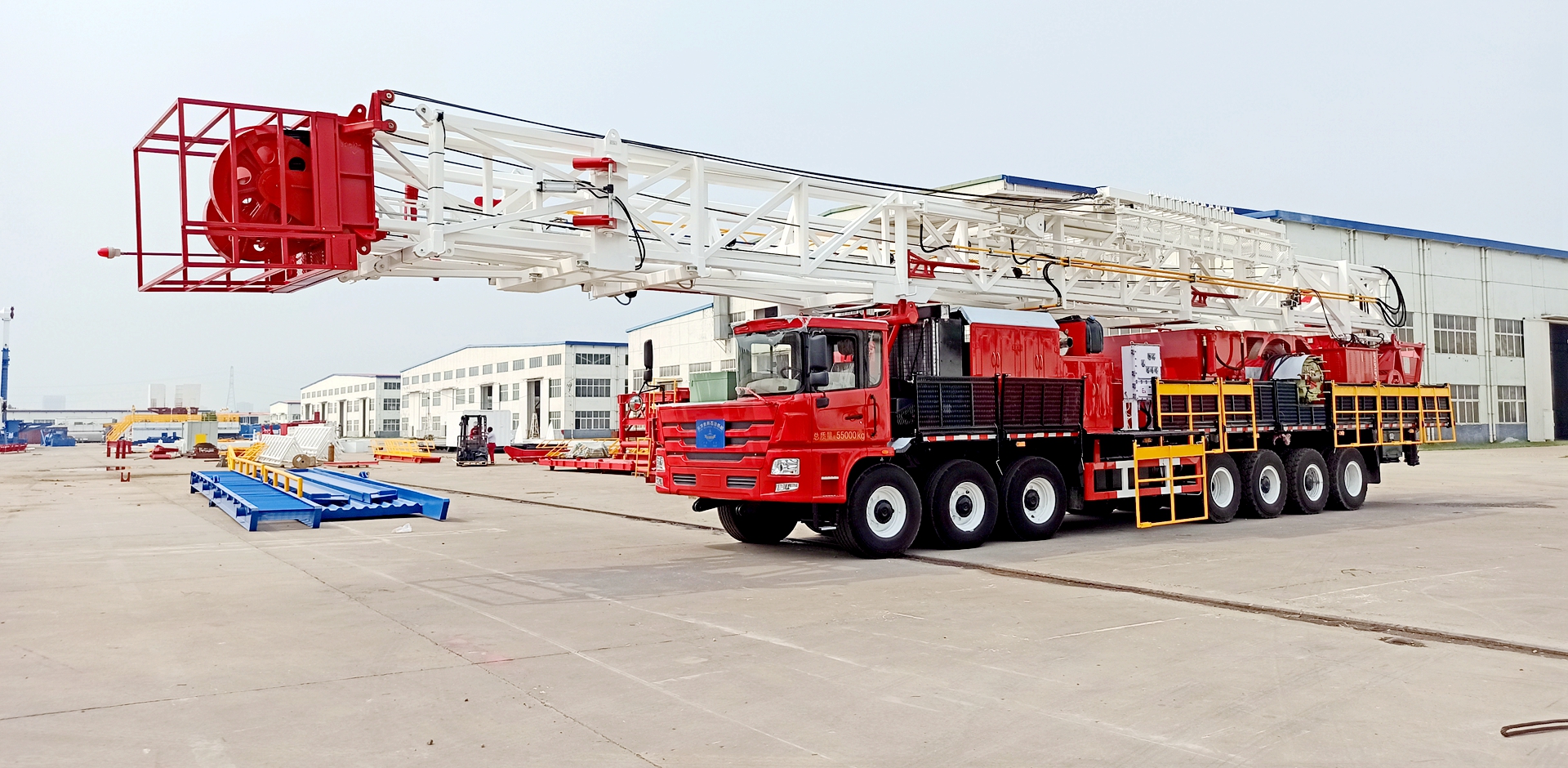 車裝鉆機是將動力系統(tǒng)、絞車、井架、游車系統(tǒng)及傳動系統(tǒng)等部件全部裝載于自走式底盤上。具有作業(yè)負荷大、性能可靠、越野能力強、移運方便,作業(yè)和搬遷費用低等特點。